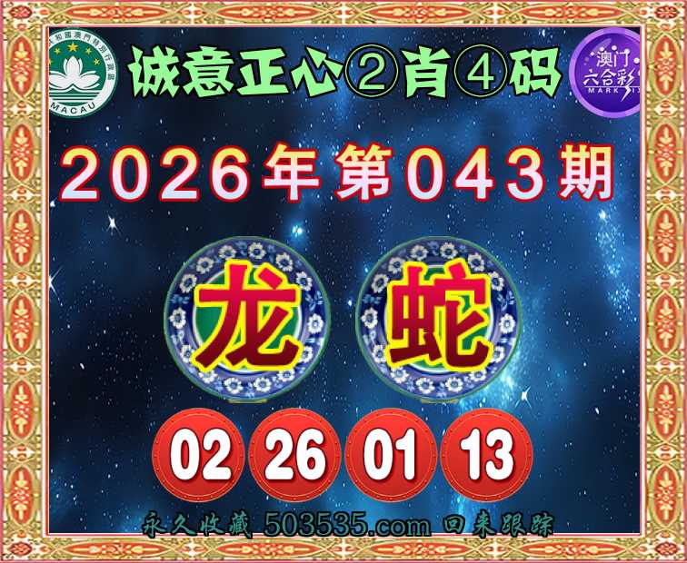 043期: 🧩『诚意正心』 🧩②肖④码🧩【龙】【02.26.01.13】开:蛇13